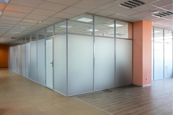 Матовые стеклянные противопожарные перегородки могут изготавливаться как в полностью остекленном варианте, так и в частично остекленном исполнении. Основное предназначение таких конструкций — это разделение общего помещения на несколько отдельных рабочих зон. При этом преследуется несколько целей: